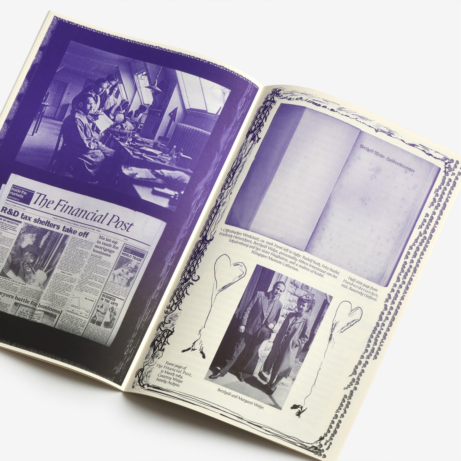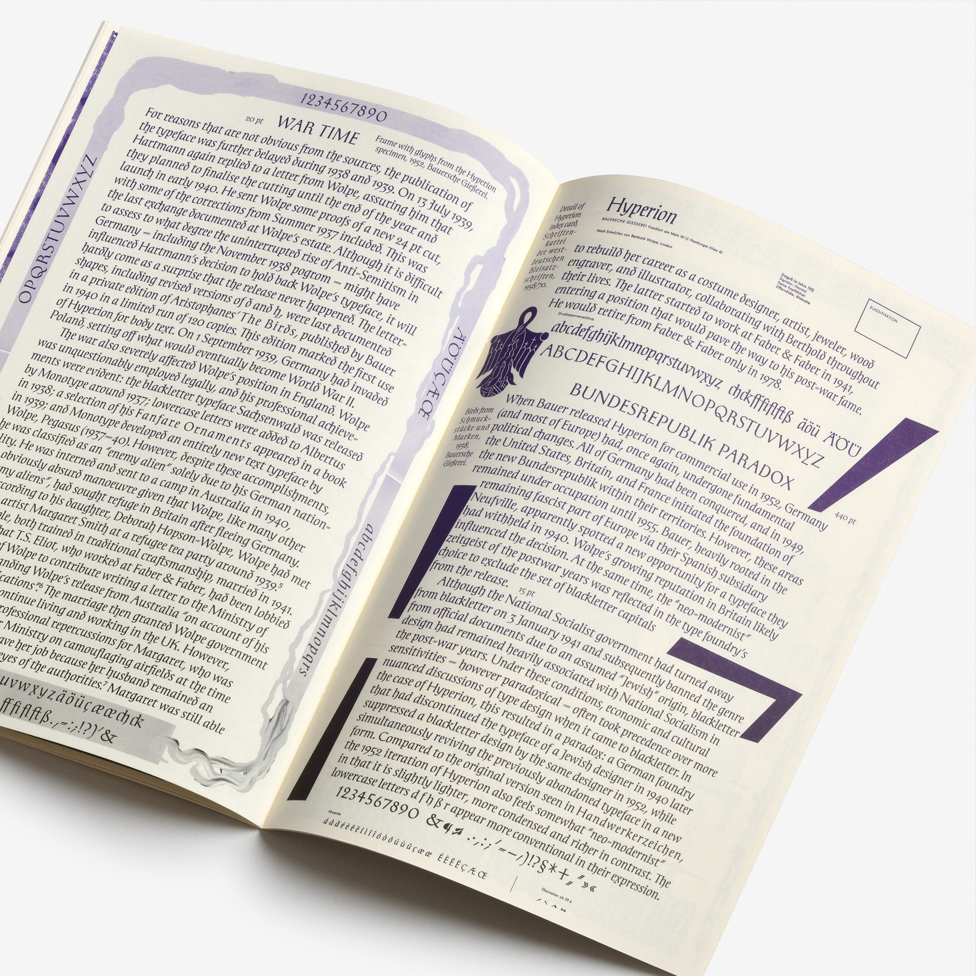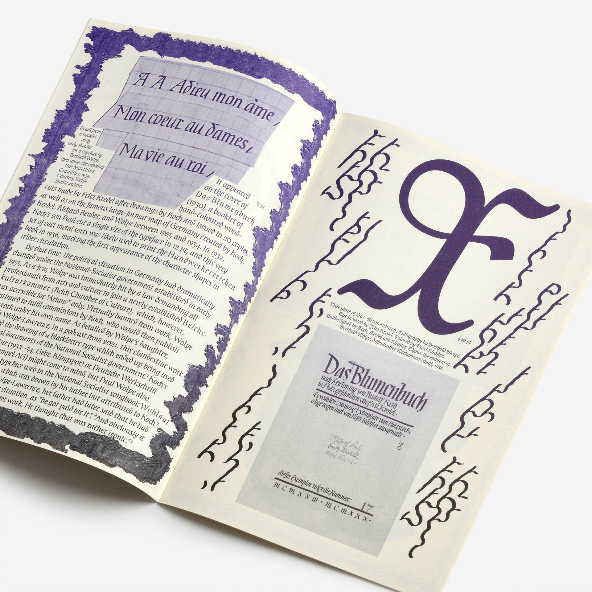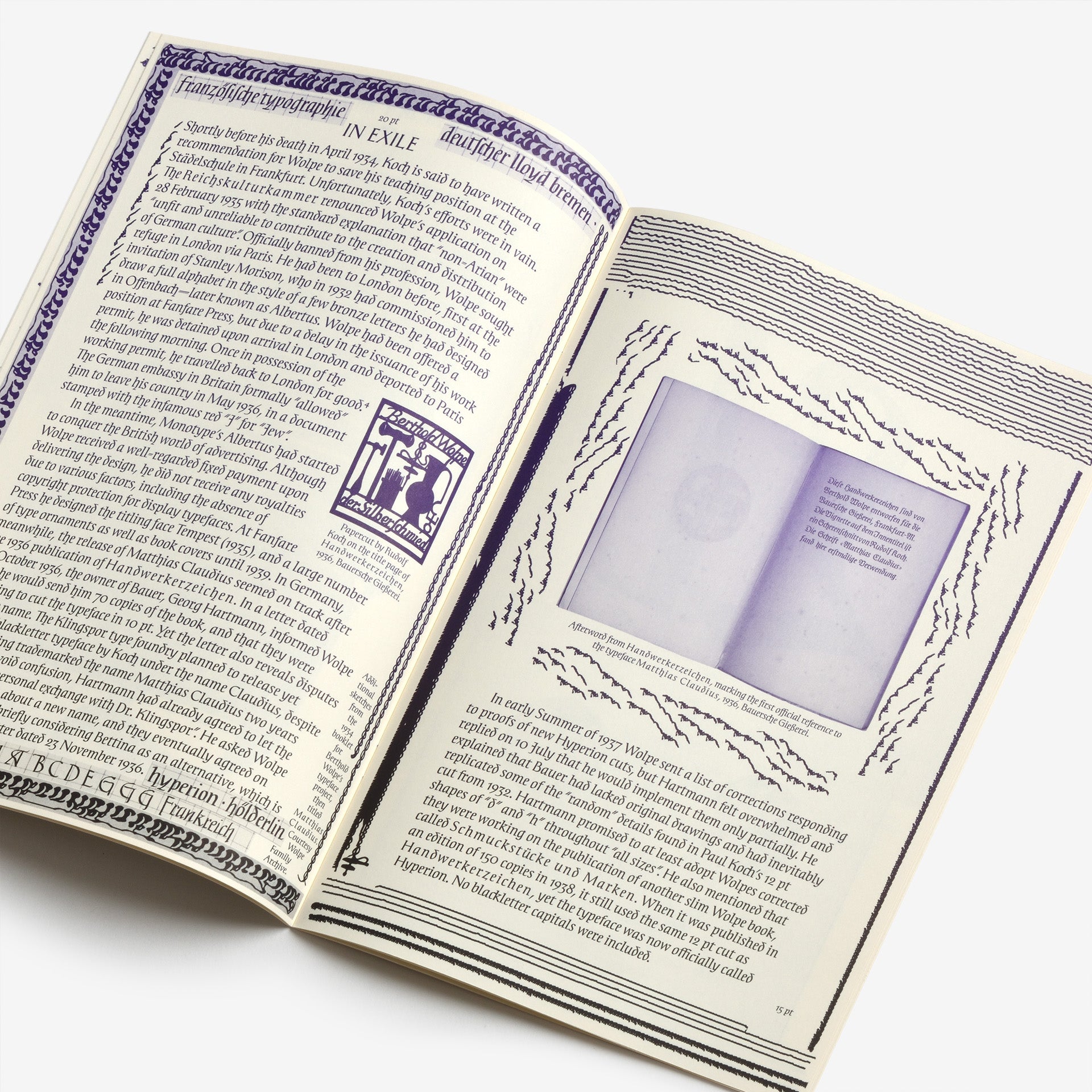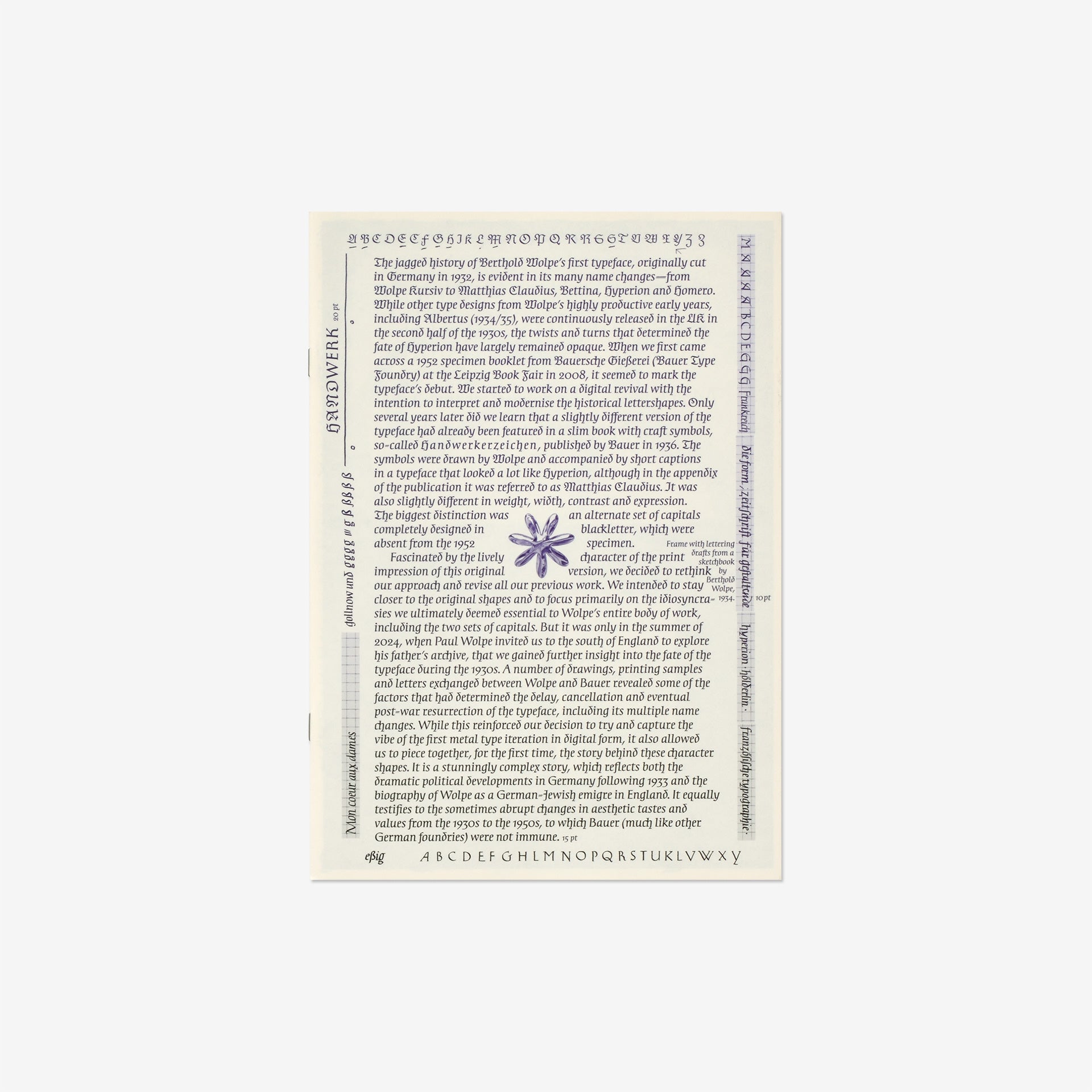 ドイツ人タイポグラファー、ベルトルド・ヴォルペ(Berthold Wolpe)の初期のデザインを復活させた書体「Handwerk」の見本。もともとは「Wolpe Kursiv」と呼ばれ、1932年にパウル・コッホ(Paul Koch)によって金属カットされました。この書体は1936年に初めて発表されましたが、ナチス政権下でユダヤ人デザイナーとして迫害を受けたため、ヴォルペの作品は遅延と改訂を余儀なくされ、最終的に1952年に改良版として発表されました。「Handwerk」はオリジナルの手書きの雰囲気を捉え、1952年に発表されたものとオリジナルのブラックレターの大文字の両方を参照したスタイルセットを収録しており、ウォルペの書体デザインに歴史的な視点を提供しています。